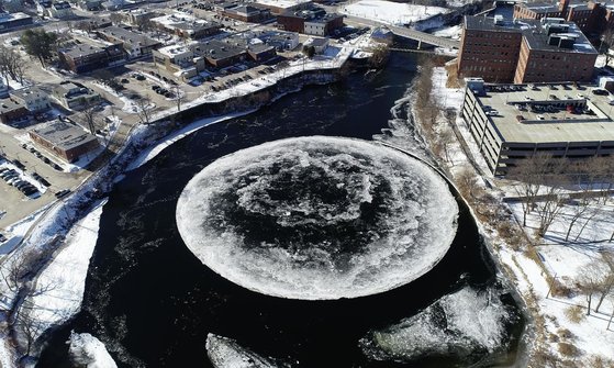 미국 메인 주 웨스트브룩 프리섬스코트 강 한가운데 지름 100m에 육박하는 거대한 원형 얼음판이 발견돼 화제다. 14일(현지시간) 빌견된 이 원형 빙판은 서서히 시계 반대방향으로 돈다. 약 1분에 한 바퀴를 도는 것으로 관측됐다.